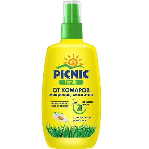 Спрей с экстрактом ромашки «Picnic» гарантированно защитит вас и ваших родных от комаров, мокрецов и москитов. Выезжая на природу или прогуливаясь по городу, не дайте насекомым испортить ваш отдых.