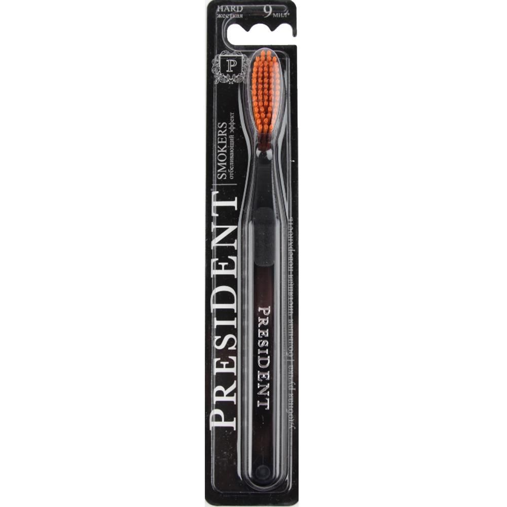 Зубная щетка PresiDENT Smokers с отбеливающим эффектом для курильщиков, любителей чая и кофе. Комбинированная щетина пропитана карбонатом кальция (CaCO3) для эффективного отбеливания эмали. Черные щетинки средней жесткости тщательно очищают, не травмируя десны. Жесткие белые щетинки идеально полируют. Зубная щетка двух степеней жесткости : Средней степени жесткости щетинки-черного цвета; Жесткие щетинки-белого цвета . Продукт стерилизован во время упаковки. Щетинки щетки - с защитным чехлом.
