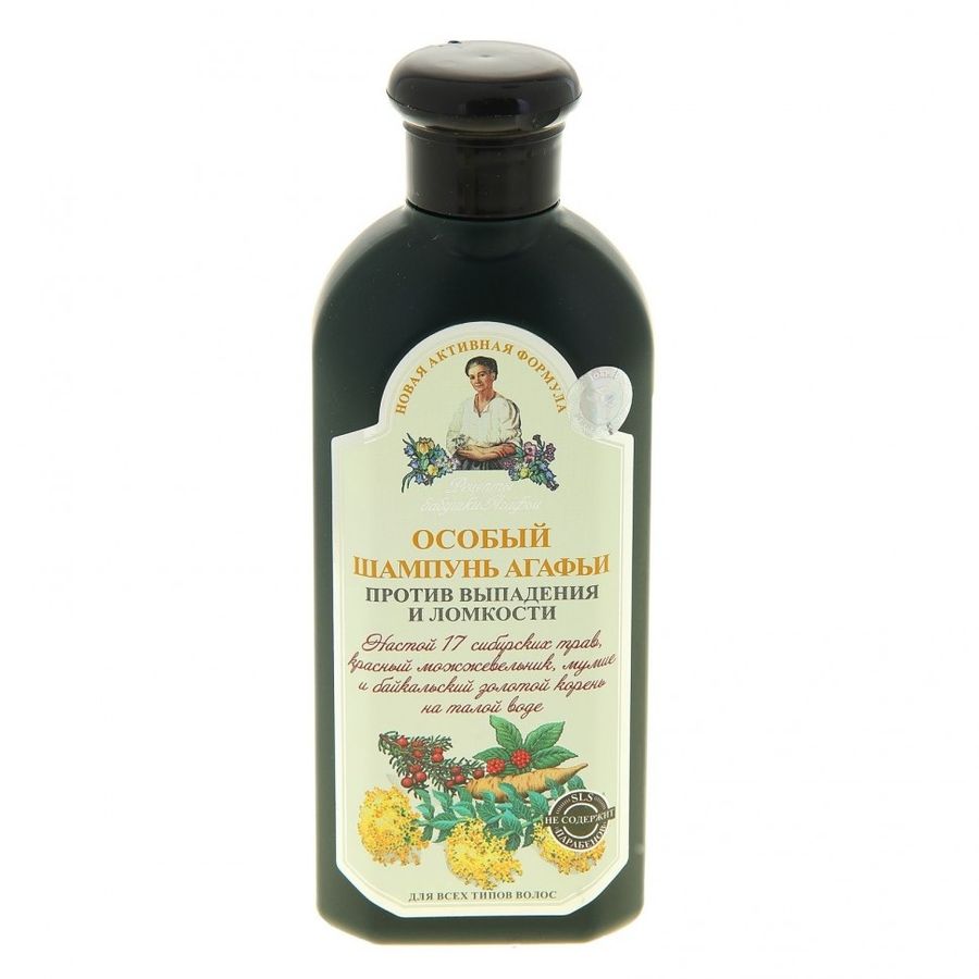 Шампунь против выпадения волос Рецепты бабушки Агафьи Особый создан на настое 17 сибирских трав, красного можжевельника и байкальского золотого корня на талой воде, с добавлением мумие, спасет волосы от выпадения, придаст им прочность и обеспечит здоровый рост.