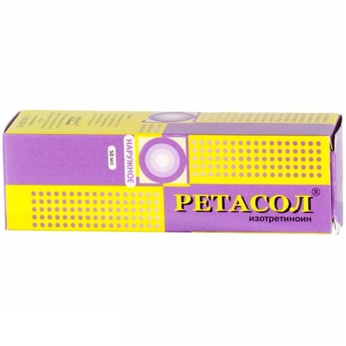 Ретасол - средство для лечения угрей. Ретасол способствует нормализации терминальной дифференциации клеток, тормозит гиперпролиферацию эпителия выводных протоков сальных желез, образование детрита и облегчает его эвакуацию. За счет этого снижается выработка кожного сала, облегчается его выделение, нормализуется состав, снижается воспалительная реакция вокруг желез. При наружном и системном применении оказывает антисеборейное, себостатическое, противовоспалительное, керато- и иммуномодулирующее действие; усиливает процессы регенерации в коже.