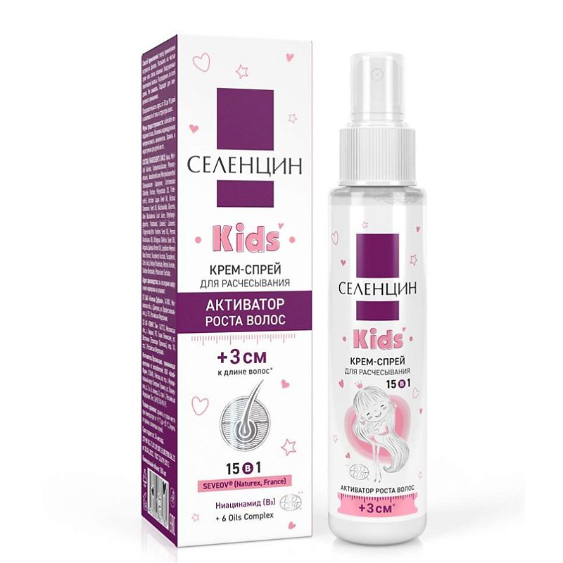 OILS СOMPLEX (комплекс масел: Арганы, Бабассу, Авокадо, Виноградной косточки, Репейное, Касторовое) — восстанавливает и защищает поврежденную структуру волос, увлажняет и питает кожу головы, придает здоровый и ухоженный вид. При регулярном использовании детскийкрем-спрей для волос Селенцин сделает детские волосы сильными, упругими, гладкими и блестящими. Витамины для волос в составе комплекса выполняют функции: рост волос, укрепление волос, восстановление волос.
