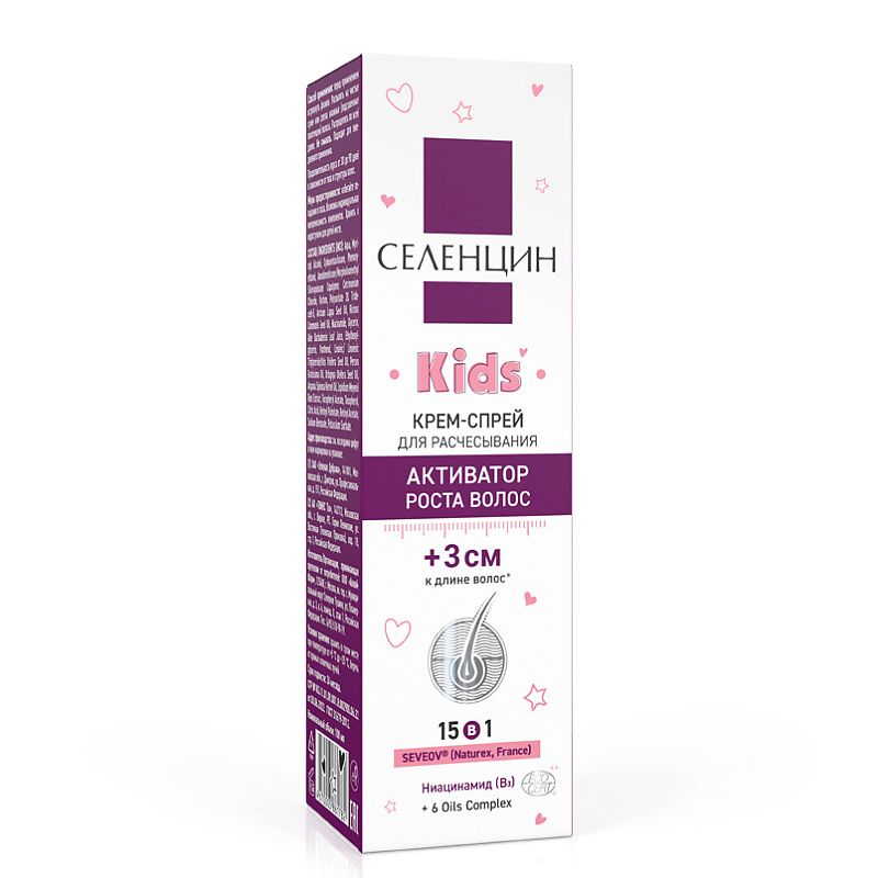 Детские косметические средства для роста волос Селенцин основаны на растительном активном ингредиенте Seveov – это специализированный запатентованный комплекс от компании Naturex (Франция). Экстракт перуанской маки регулирует жизненный цикл фолликулов. Ниацинамид (Витамин B3) — препятствует затвердеванию коллагена вокруг волосяной луковицы, предотвращает выпадение волос, продлевая их жизненный цикл. Усиливает микроциркуляцию в коже головы, запускает процессы активации роста волос. Органический сок алоэ — питает волосяную луковицу, укрепляет корни волос, останавливает выпадение и улучшает прочность стержня волоса.