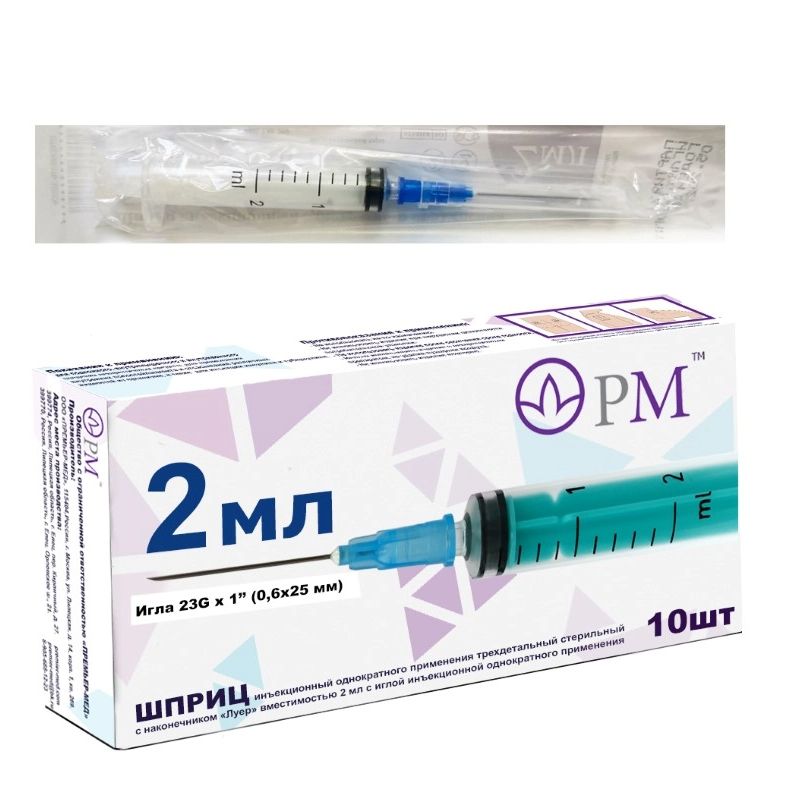 - Шприц трехдетальный 2мл игла 23G 0,6x25мм N100 Премьер-Мед