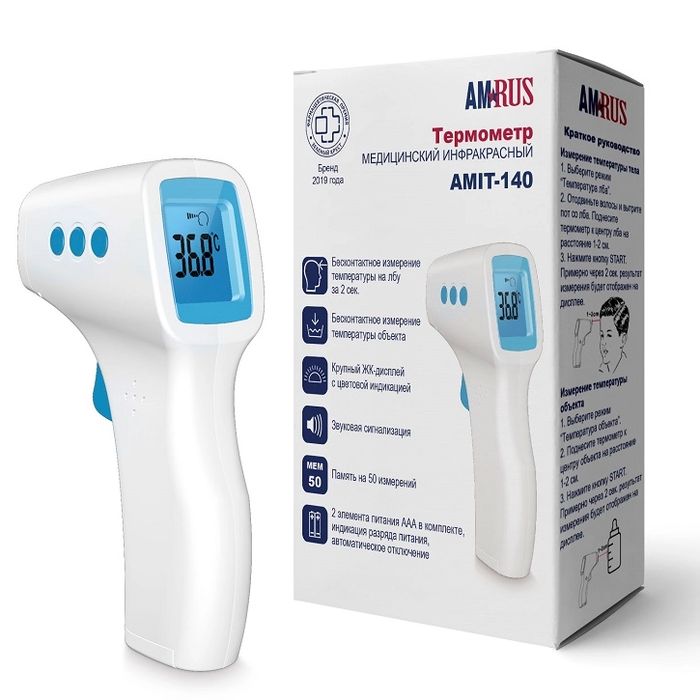 Инфракрасный медицинский термометр AMRUS AMIT-140 предназначен для измерения температуры тела человека (на лбу) и температуры объекта бесконтактным способом.