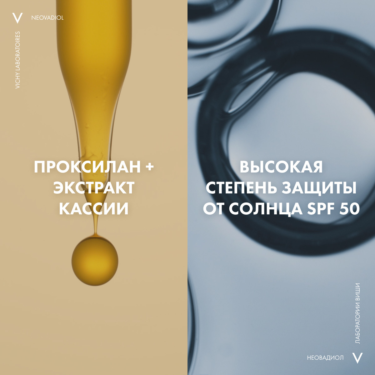 Лаборатории VICHY разработали крем, сочетающий в себе восстанавливающий проксилан и экстракт кассии растительного происхождения, ниацинамид (витамин В3), питательные жирные кислоты Омега-3-6-9, а также фильтры широкого спектра действия (SPF 50) для защиты кожи от воздействия UVA-UVB-излучения. Формула крема помогает снизить воздействие ультрафиолета на кожу лица в период менопаузы, улучшая ее внешний вид. День за днем кожа становится более упругой, морщины и пигментные пятна становятся менее заметными, кожа сияет.