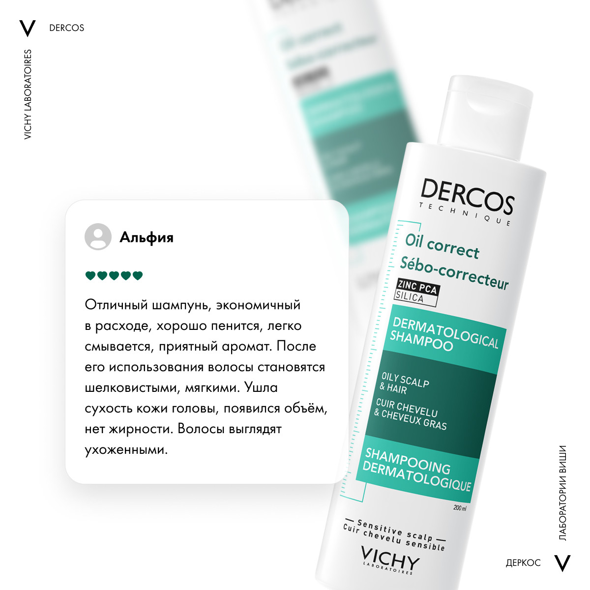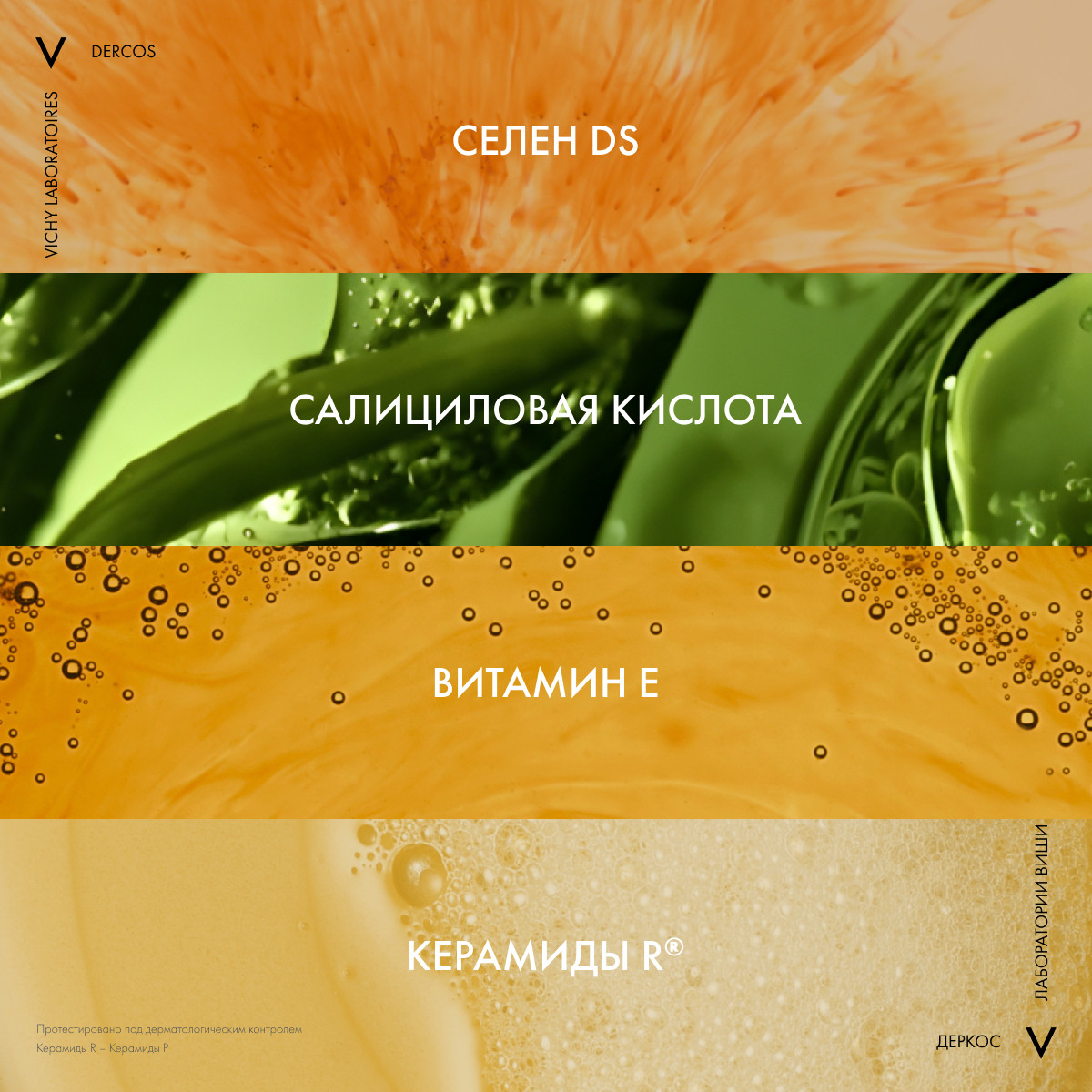 Содержит себорегулирующий комплекс. Эксклюзивное сочетание активных веществ, специально подобранных и тщательно дозированных для ограничения контакта кожного себума с волосами и сохранения естественного баланса кожи головы. Гипоаллергенно. На основе Термальной Воды Vichy. Текстура полупрозрачного флюида.