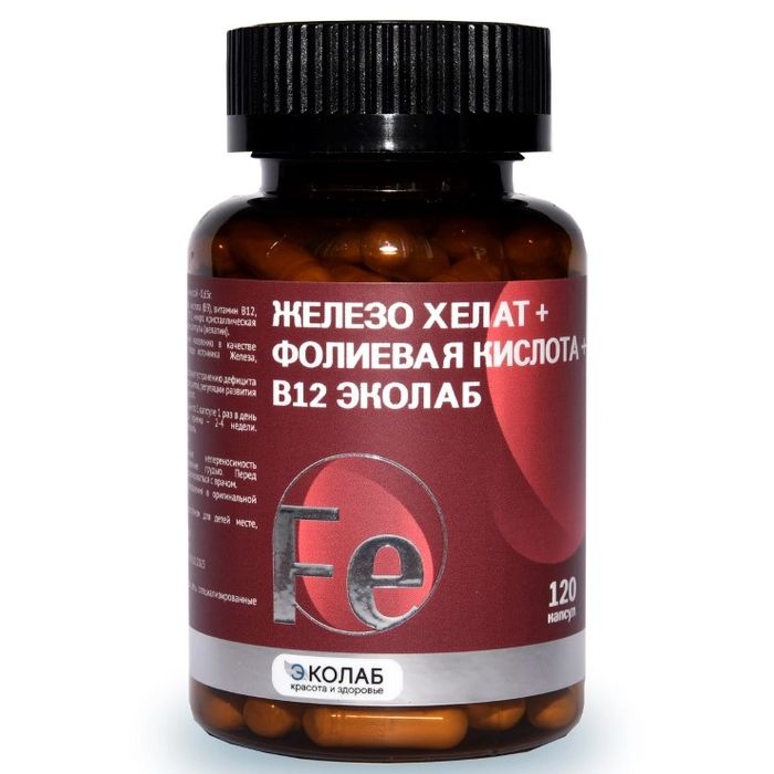 - Железо хелат + фолиевая кислота + В12 капсулы 0,65г N120 Эколаб