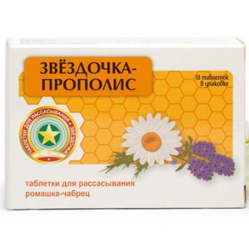 Звёздочка-прополис — эффективная комбинация экстрактов природного происхождения. Активные компоненты, входящие в состав таблеток для рассасывания, рекомендованы при кашле, болях в горле, стоматите, повреждении слизистой рта, для лучшего заживления микротравм ротовой полости и при простудных респираторных заболеваниях.Применение